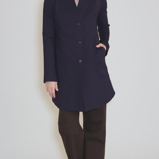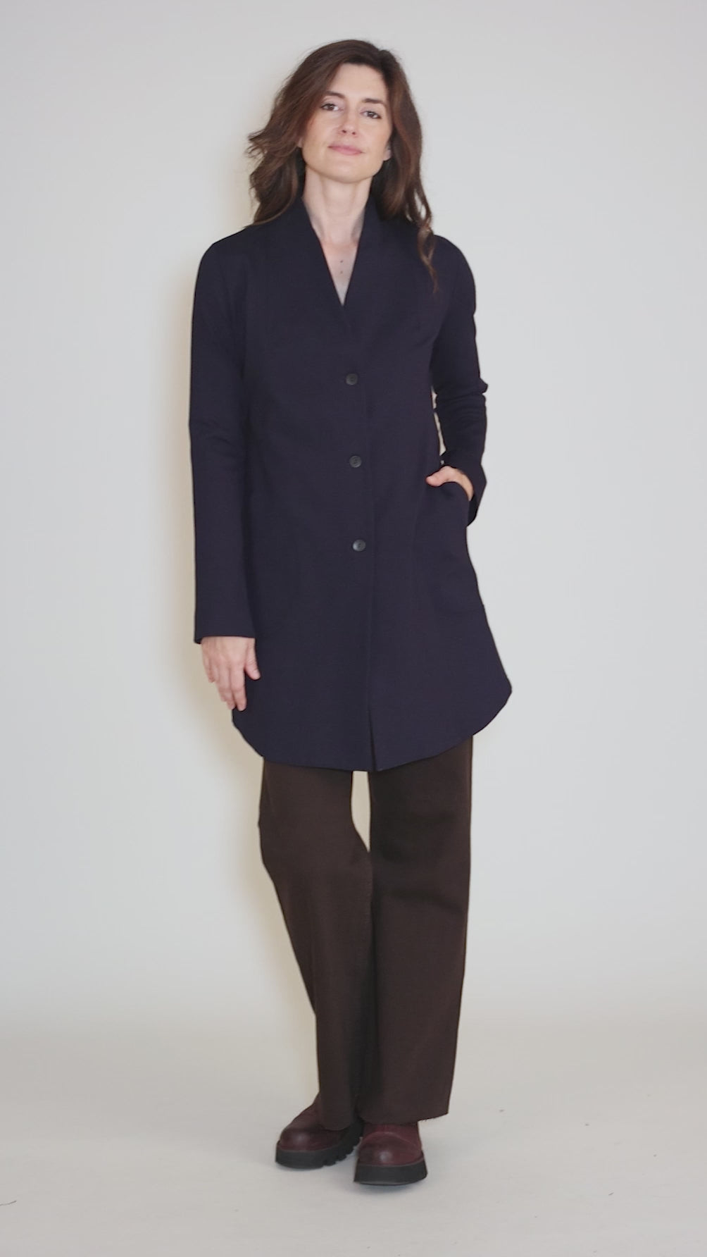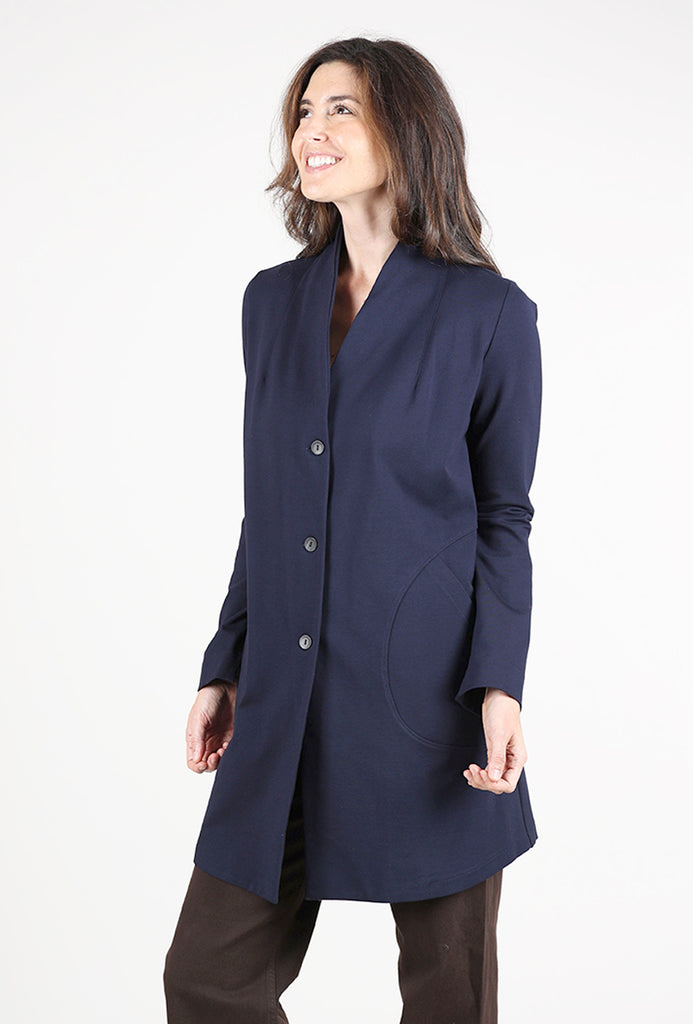 Porto's Steward Jacket is done in a substantial ponte knit. It has a refined mandarin collar, a set-in shoulder with long sleeves and a button-front placket. The silhouette is a trim A-line, with slit pockets on the hips. The vibe is tailored, but the fit is quite comfortable. Running true to size, though perhaps not as generously through the hips as some Porto fans would prefer.