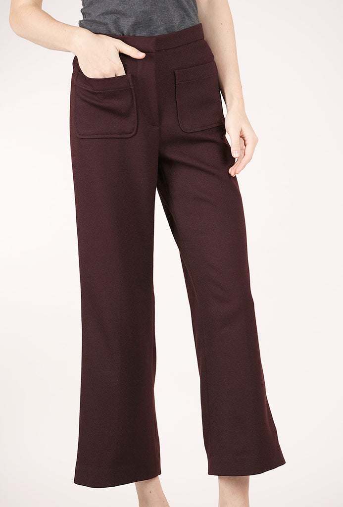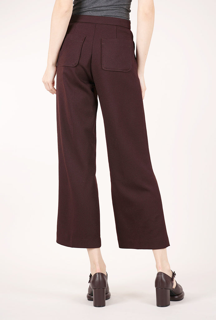 Made in a refined viscose-poly blend with the hand and structure of wool (but without the itch factor!), Alberwool has a higher rise, with a set-in waistband and full, straight legs that flare a bit to the ankle. Patch pockets sit on the front hips and on the rear. The fit is tailored.