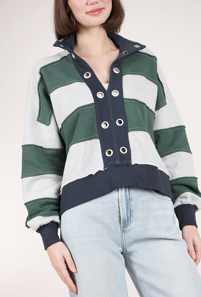 This rugby-inspired sweatshirt is baggy in all the right places. It has an exaggerated drop-shoulder construction, with a spread collar and extra-long dolman sleeves that end in a cuff. A double row of rivets run down a center seam, and the slightly cropped hemline is lightly ribbed. The fit here is quite generous.