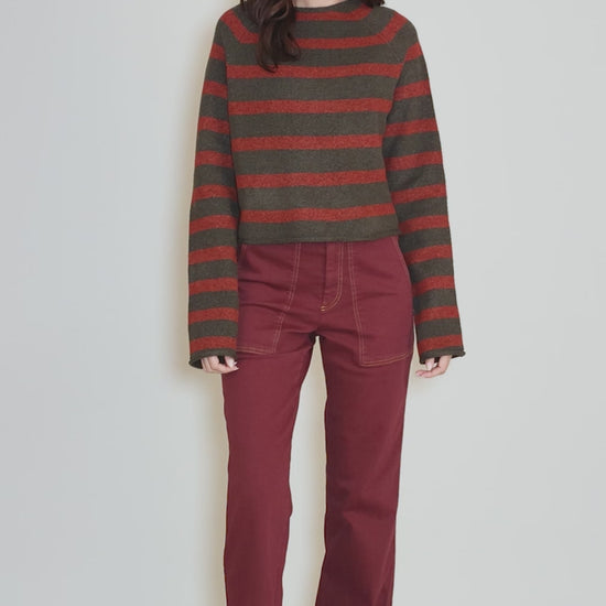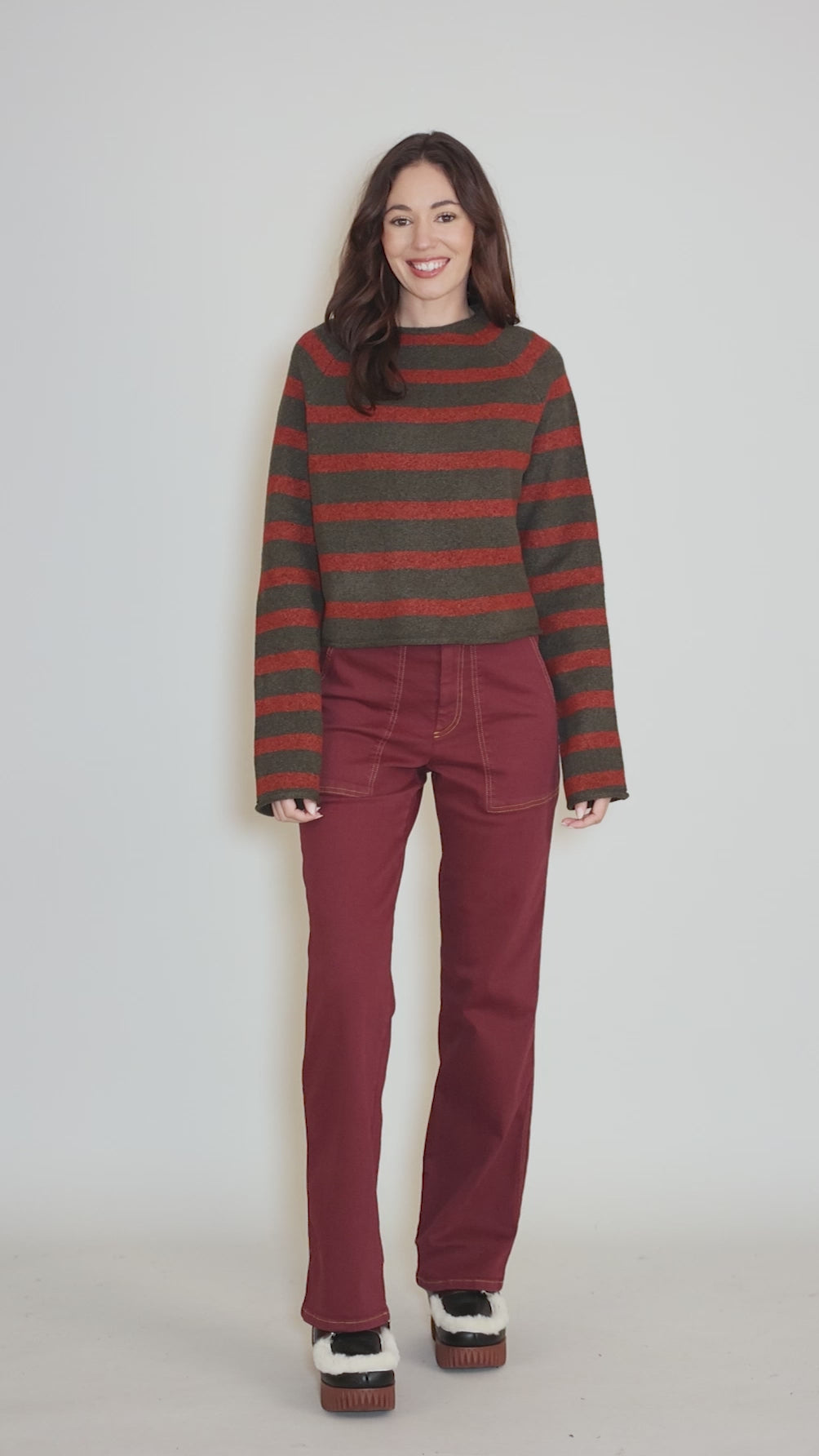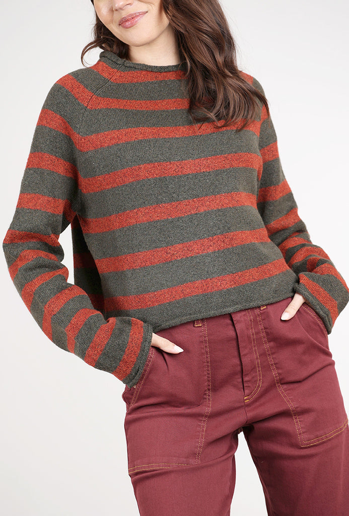 There are a lot of fun sweaters in our most recent Grade & Gather shipment, but this one might be our favorite! It's done in a densely knit acrylic blend, both soft and substantial, with a short mock neckline, extra-long raglan sleeves and a deliberately boxy, slightly cropped silhouette. The colors are just so FALL -- alternating stripes of forest green and deep rust.