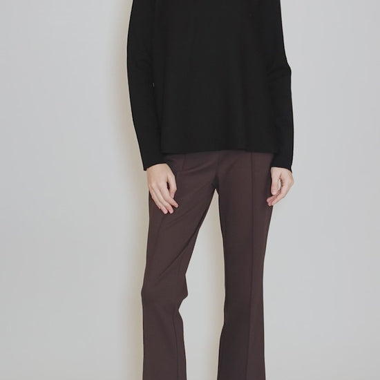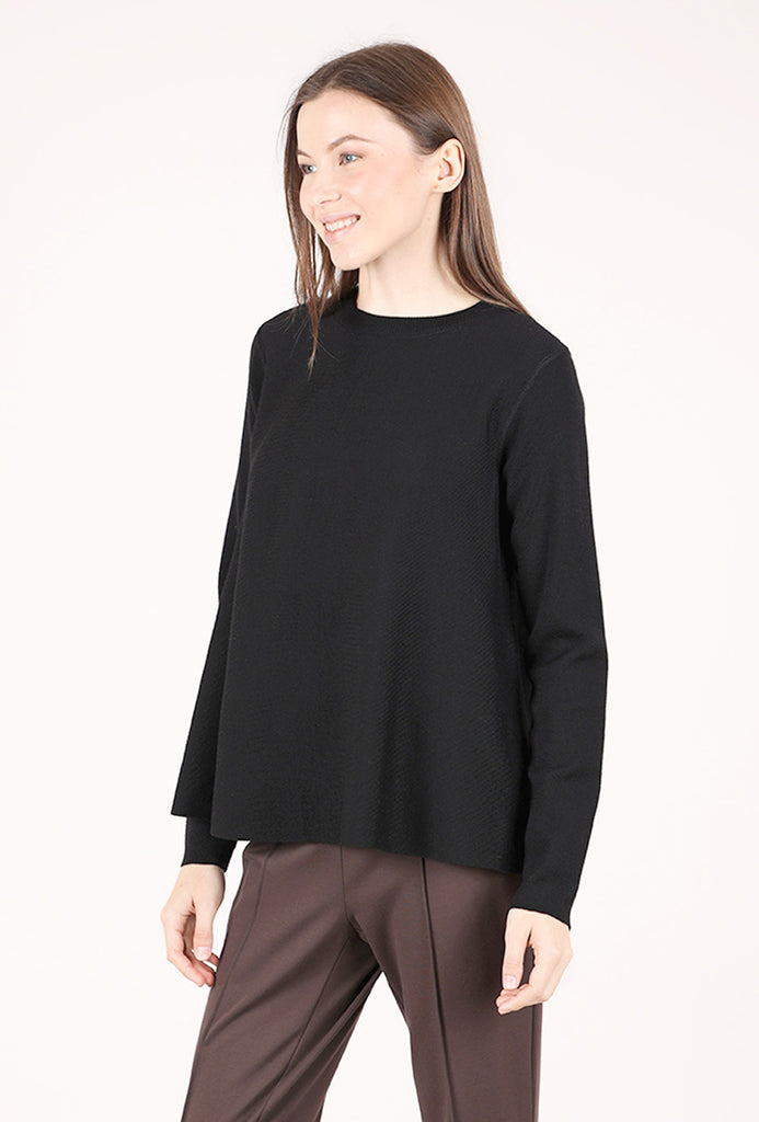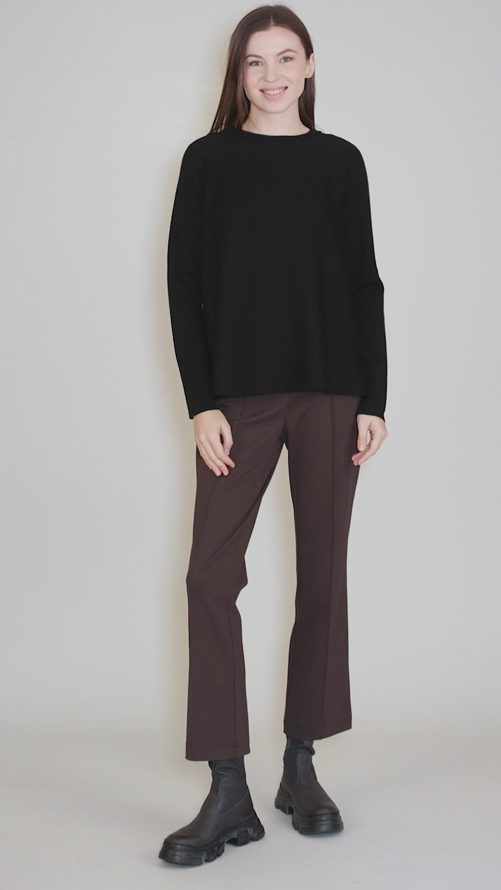 The epitome of quiet luxury, this beautifully made sweater from Hannes Roether has a crew neckline, with a set-in shoulder, long sleeves and a swingy, A-line shape. The wool is quite densely knit, adding structure to the silhouette. A terrific choice for those who tend to carry weight through the middle!