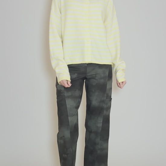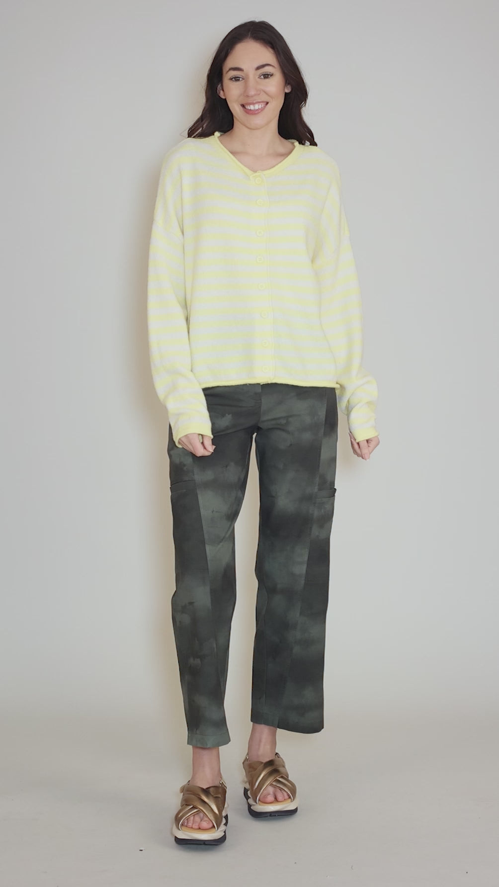 An ideal piece for spring transition! Sunny Side offers warmth for the chilly months ahead, but the cheerful yellow stripes on an off-white background hints to the warmer days beyond them. The sweater is made in a soft poly blend, with a rounded neckline, a slight drop-shoulder construction and a button-front placket. The fit is quite relaxed; we suspect some customers will opt to size down in this style.