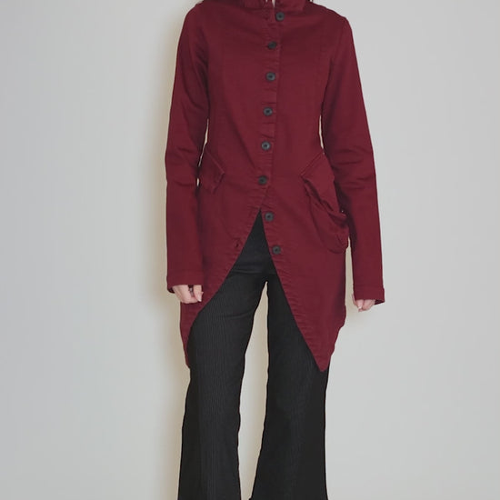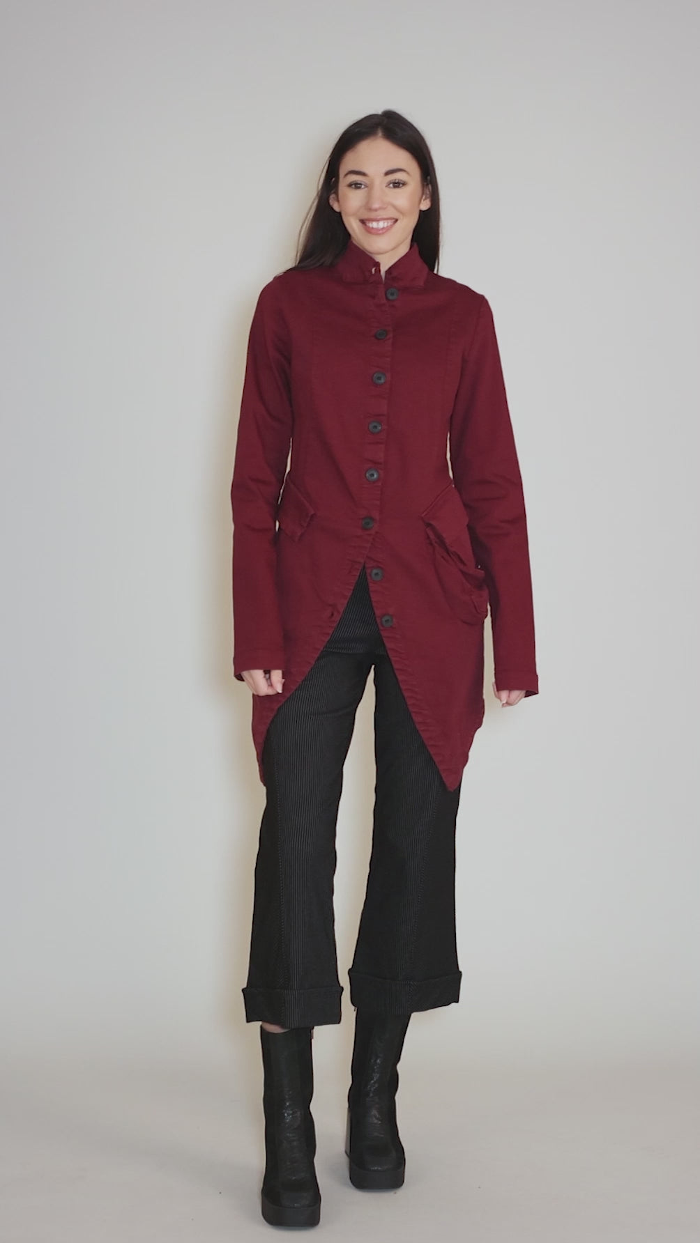 A proper little frock coat, this striking topper is just a bit exaggerated in everything, from the extra-long sleeves to the lantern silhouette with its high-low hemline. A button placket in front keeps the look clean to better emphasize the construction. Patch pockets sit on the hips, and princess seaming throughout creates a shapely fit. We love the fabric here, a stretchy mid-weight denim blend. We find this is running on the small side.