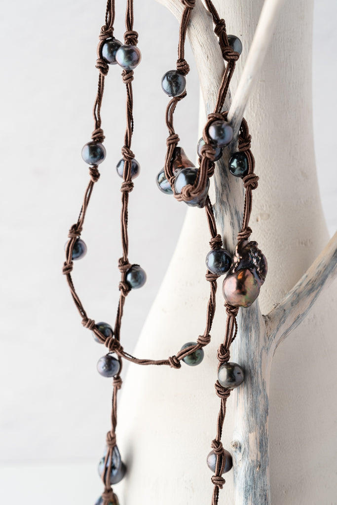 A beautifully earthy strand of chocolate-toned cord adorned with luminous peacock freshwater pearls. The Superlong Choco Necklace features a mix of round and baroque pearls, each with natural iridescence and organic shape. At 51 inches, it can be worn long, doubled, or layered for an effortlessly elegant look.