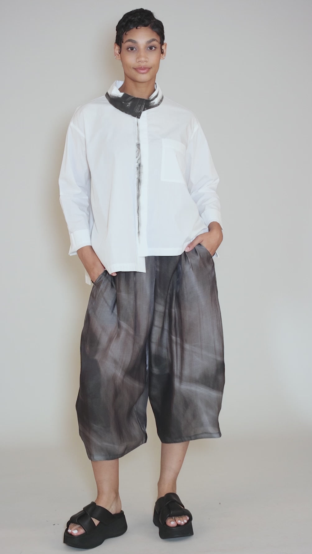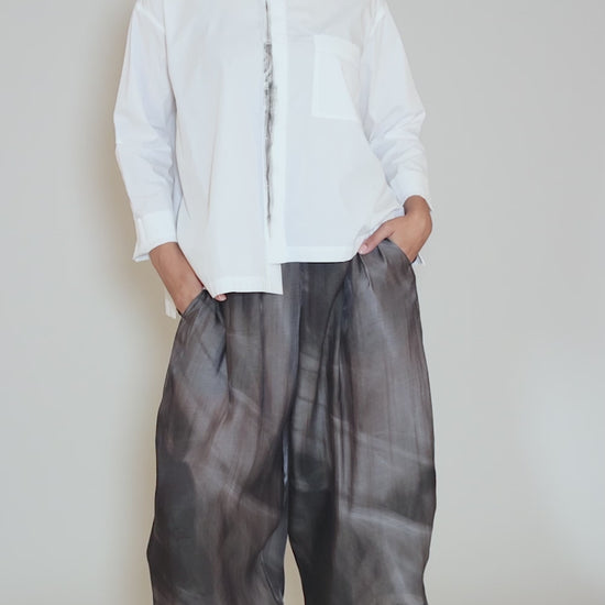 For lovers of a terrific white blouse, this quiet beauty deserves a look. It boasts a small shirt collar and a hidden button-front placket. The high-low hemline makes the most of the full, swingy silhouette, and hand-painted accents at the front lapel and at the neckline add that Moyuru touch.