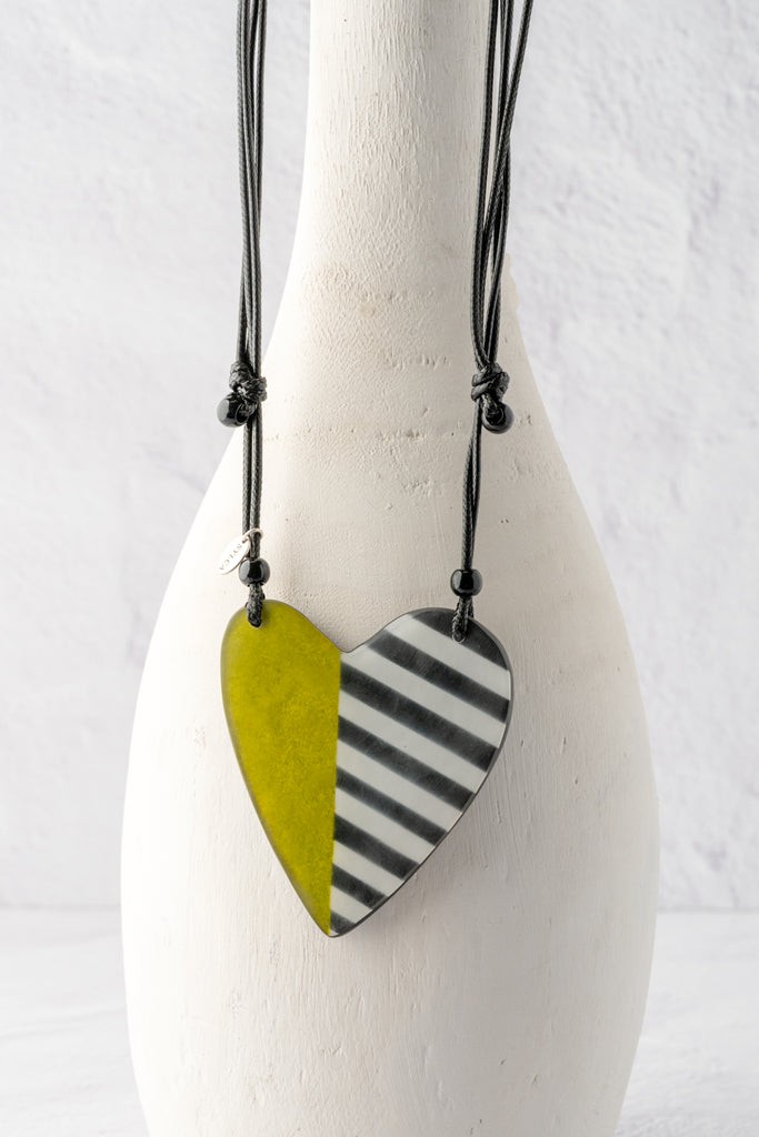 Wear your heart out with this striking pendant featuring a metallic lime green finish and bold black-and-white stripes. Sculpted from lightweight resin and suspended on an adjustable wax cord, this whimsical statement piece adds a burst of color and personality to any outfit. Distinctive, fun, and made to stand out.