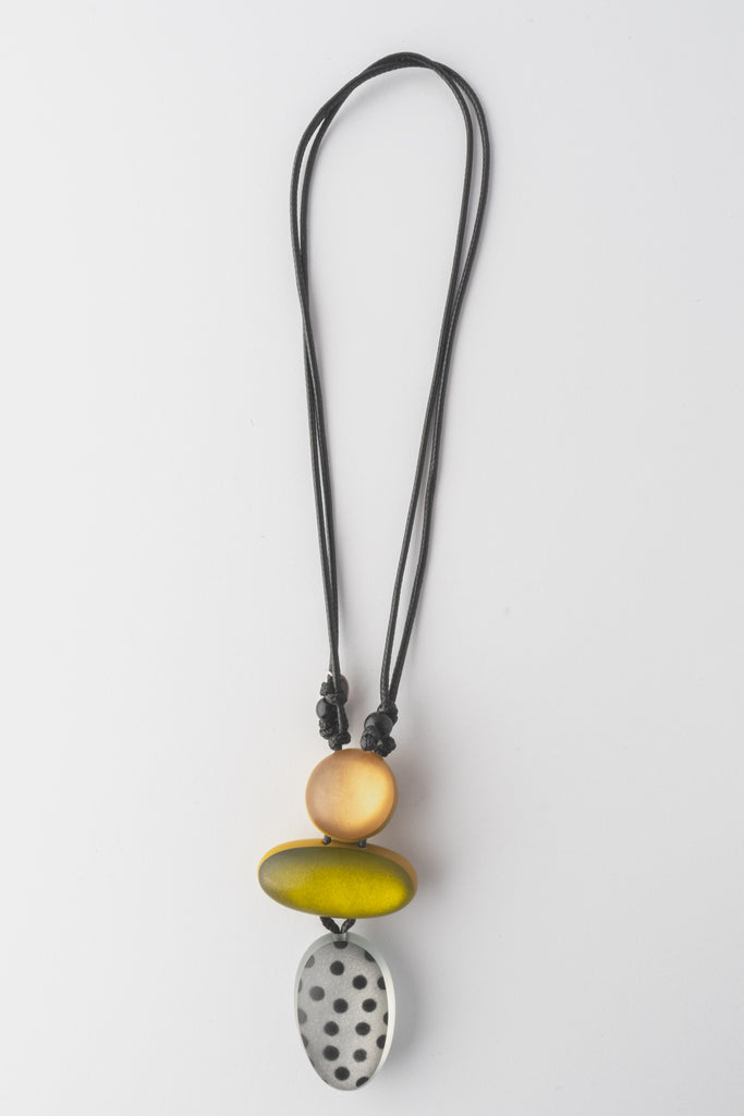 You'll love adding this pop of fun to your outfit! Sylca's triple bead pendant is adorned with lime, black and gray polka dot and taupe resin beads in round and elliptical shapes. Perfect for adding a unique and artistic touch to any look.