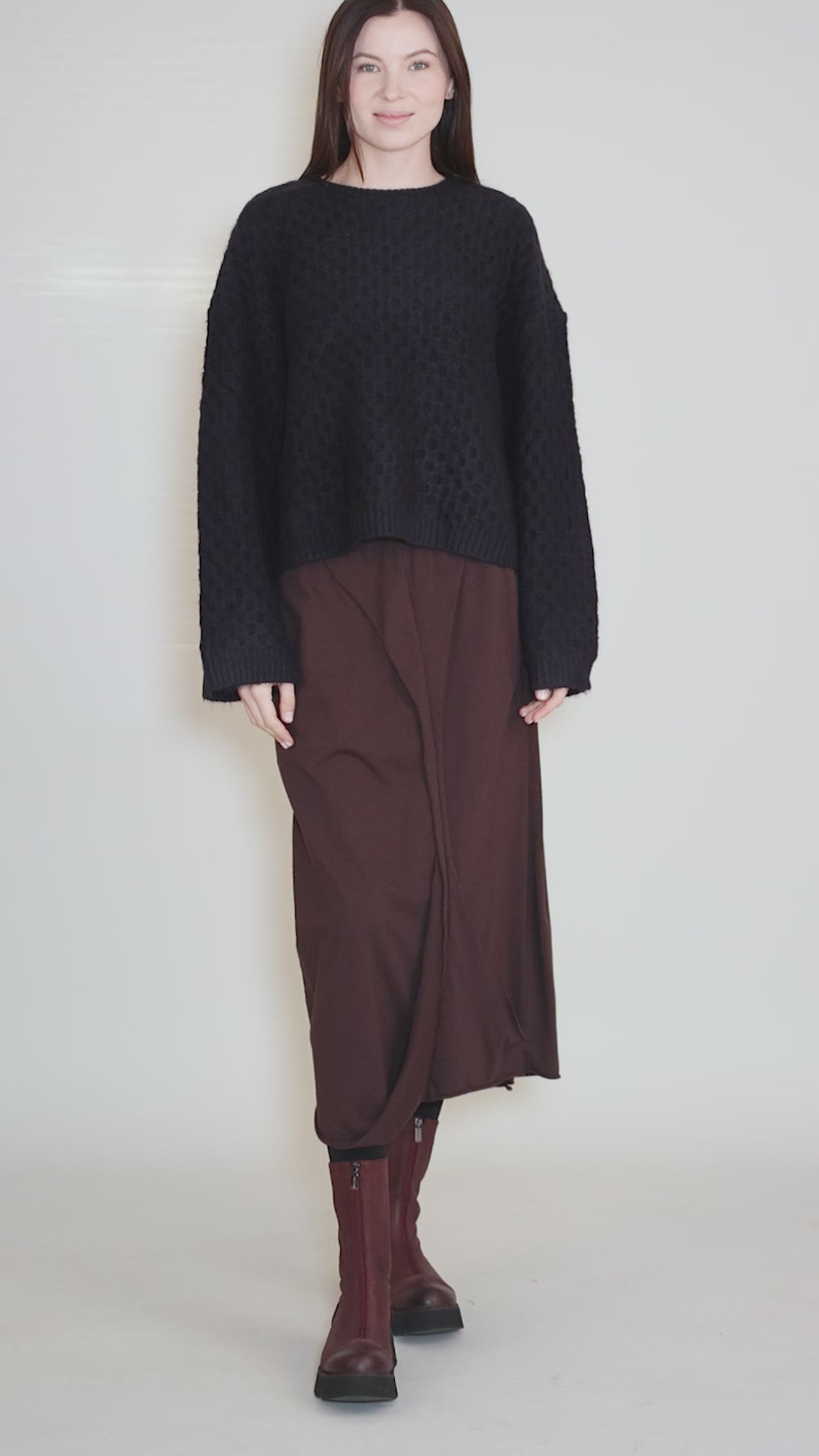 Made in a dimensionally knit acrylic blend that's both substantial and soft, this oversized sweater has a rounded neckline and a drop-shoulder construction. The body is deliberately boxy and relaxed, hitting at mid-hip on most wearers. We find this is running on the large side; many of our in-store customers are opting to size down in this style.
