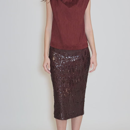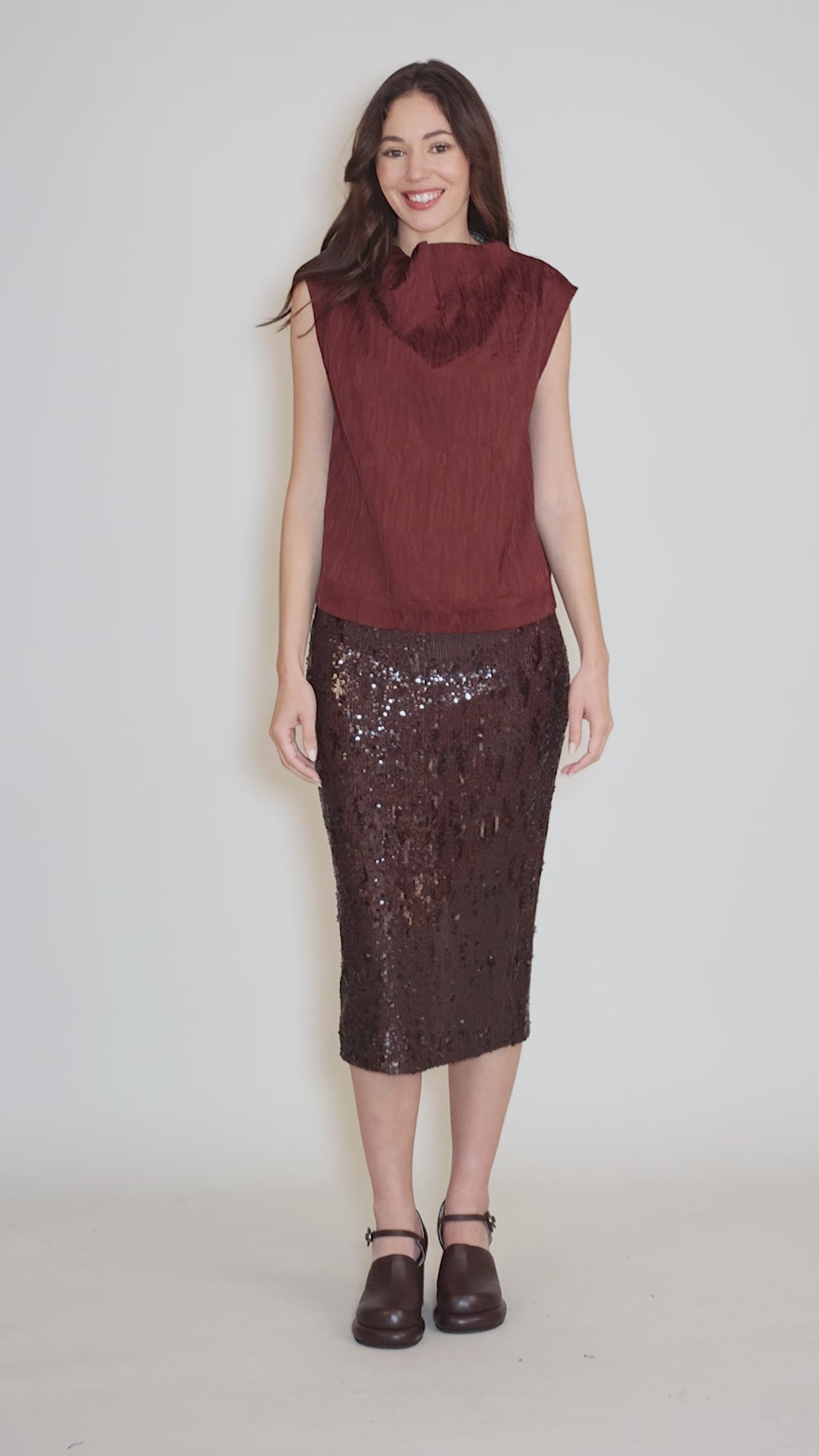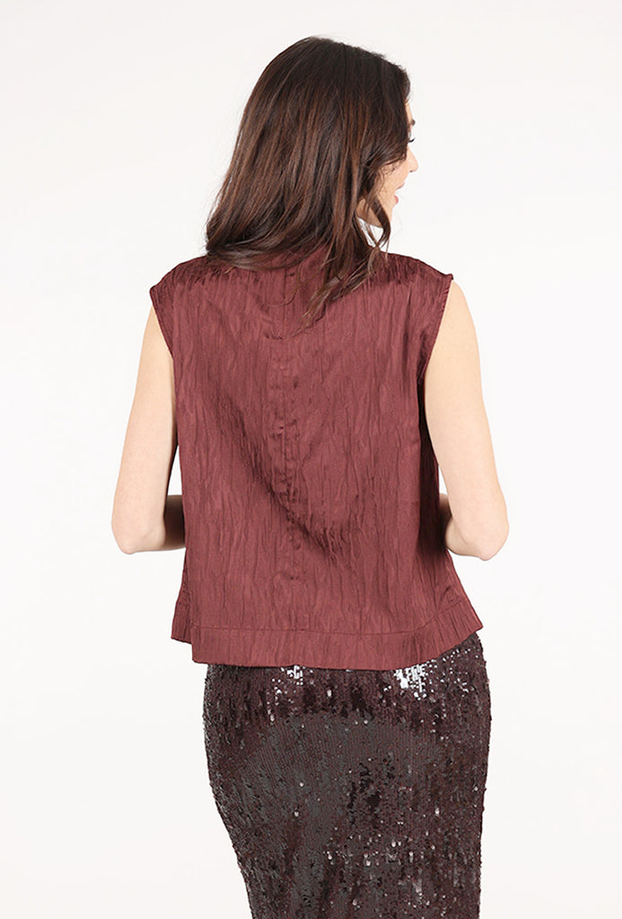 Made in a lightweight, crinkled poly with a subtle sheen and innate drape, this lovely sleeveless piece has a draped, mock neckline and a full, A-line silhouette. A quarter zip placket in back aids in easy on-off. The fit here is quite relaxed.