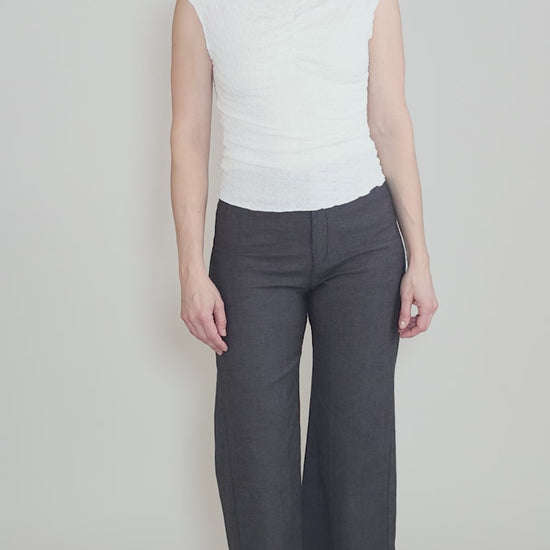 Made in a puckery textured knit, this slim tank has a tucked detail at the neckline; lettuce-edge detailing adds a feminine flourish. Running on the small side.