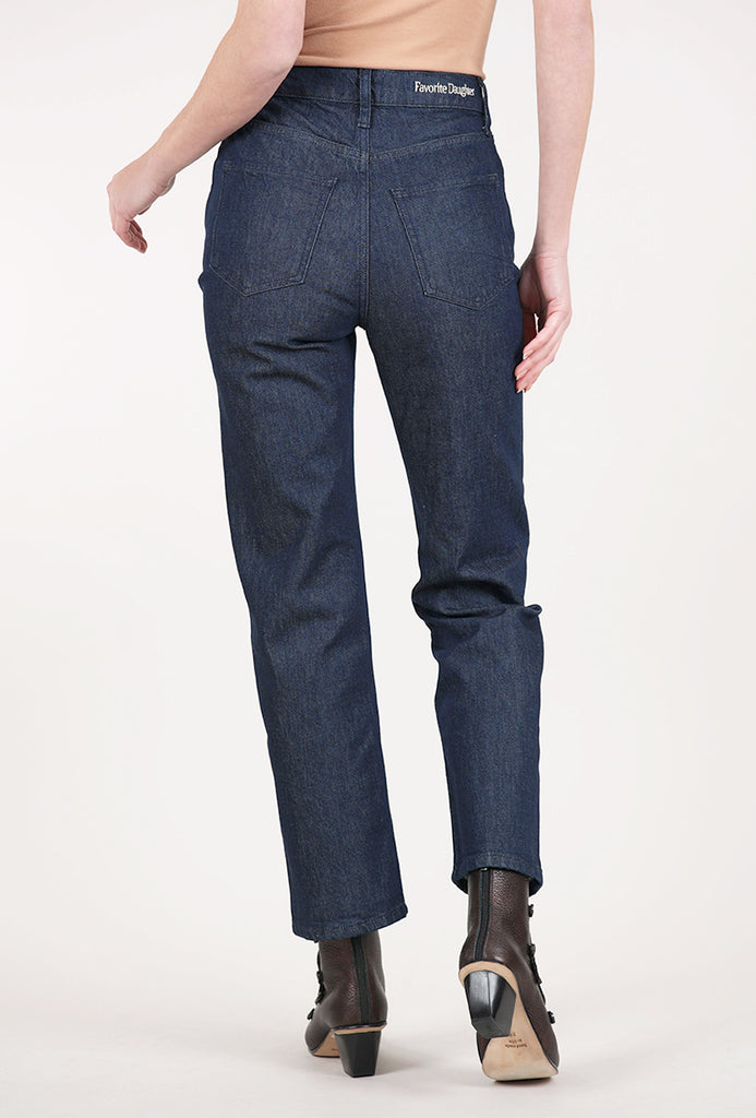 Valentina is a retro-inspired style, with an extra high-rise and a bootcut leg. It's made in a stretchy, comfortable blend that's soft to the touch; the clean, dark wash adds to its everyday versatility. Favorite Daughter embroidery sits on the back waistband.