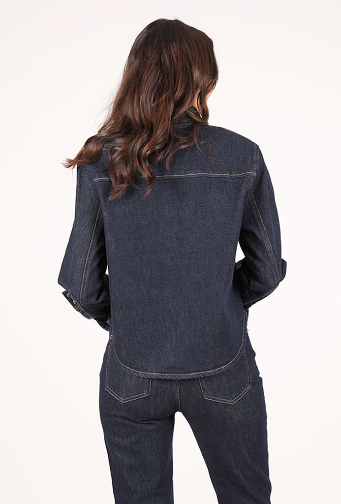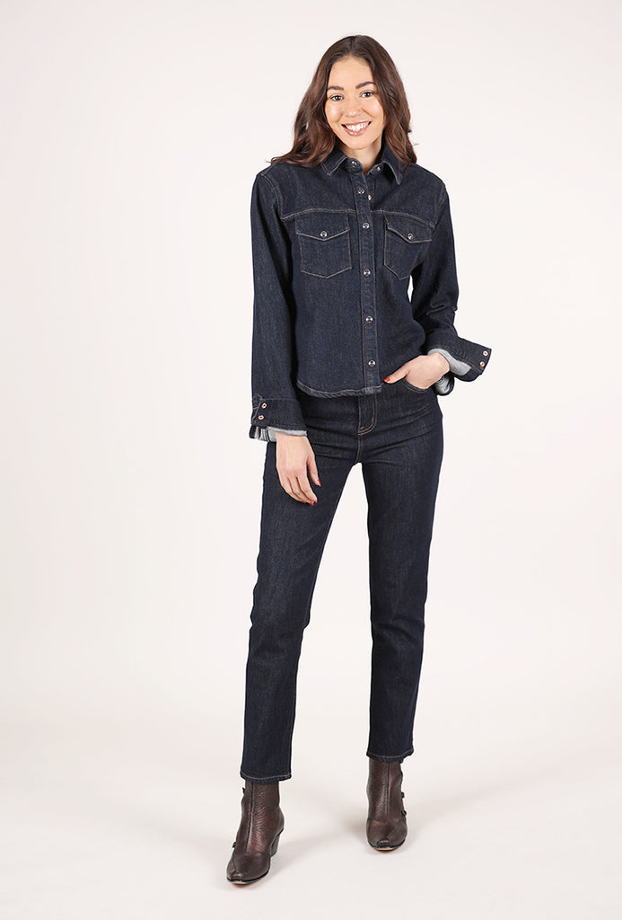 This denim shirt gets the proportions just right! Thea delivers classic button-up styling with a shrunken silhouette that feels contemporary and tailored. It's crafted from comfort stretch denim in a deep, dark rinse, with a snap-front placket and extra-long sleeves.