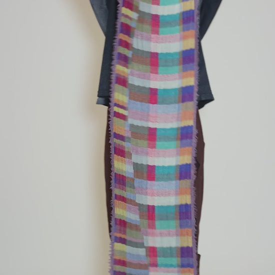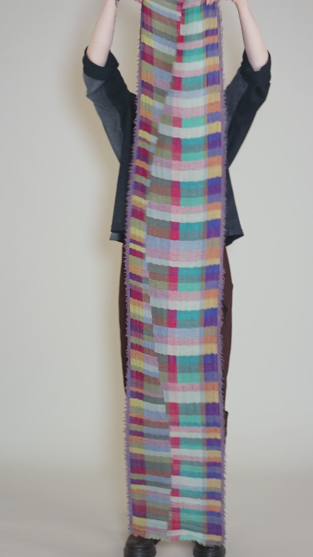 Made in a very fine boiled wool, Theo boasts staggered blocks of color in shades of blue, red, turquoise and more.