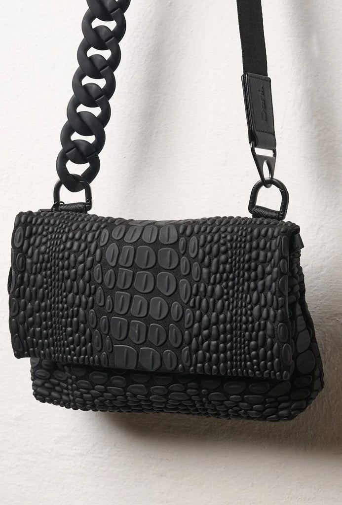 A bag with a clean silhouette and a faux croc texture developed in Daniella Lehavi's studio, creating a precise balance between softness and defined character. The folded magnetic closure, together with the chain detail, adds a modern, refined look. Both the strap and the chain are removable, allowing the style to adapt to different looks and occasions.