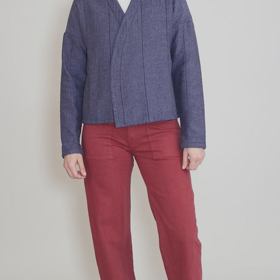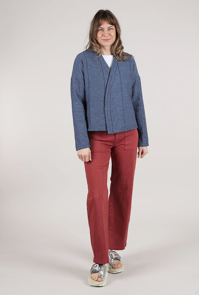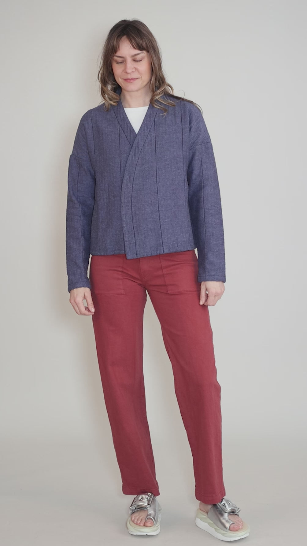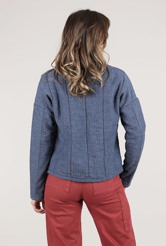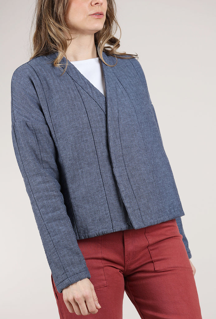 Such a great topper! Made in a quilted organic cotton blend, Topo has an open-front construction, with dropped shoulders and long sleeves. The silhouette is deliberately boxy, hitting at mid-hip on most wearers, and inside the jacket, a wide row of pockets add to its utility. Wear it now as a blazer or as an outdoor jacket when the temperature permits. Running true to size.