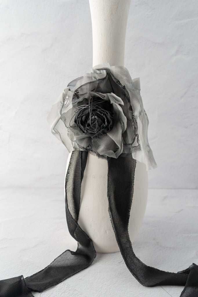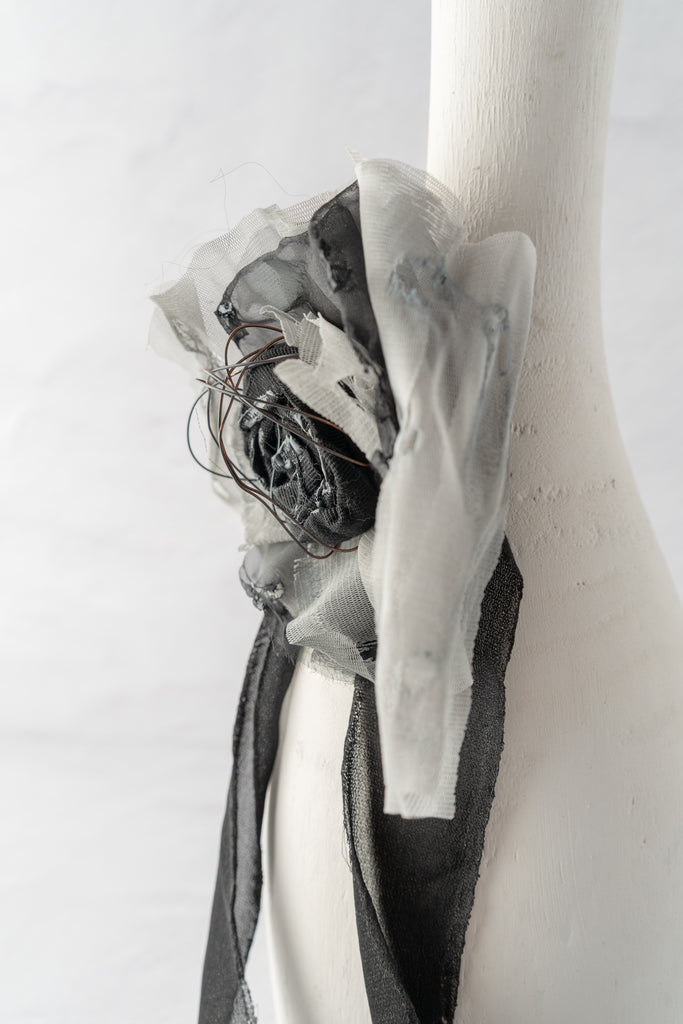 A hauntingly elegant statement piece, the Trailing Ribbon Flower Brooch embodies Sanctamuerte’s retro avant-garde sensibility, where beauty and imperfection intertwine. Handcrafted in Italy, each brooch features layers of distressed textiles shaped into a sculptural bloom, finished with raw, singed edges and fine wire detailing. Long trailing ribbons cascade from the flower, adding a sense of movement and drama that transforms any ensemble into wearable art. This piece can also be tied around the waist or the neck!