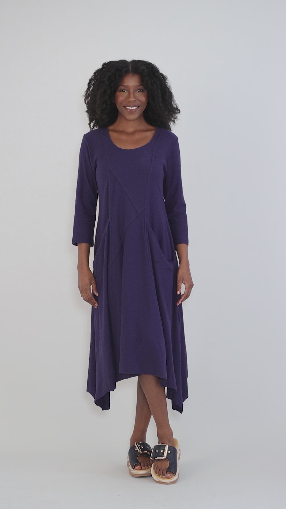 Made in a cotton slub T-shirt jersey, this easy dress has a scoop neckline, three-quarter-length sleeves and a classic fit-and-flare silhouette. Slouch pockets sit on the hips, and an uneven hemline round out Emily's charms.