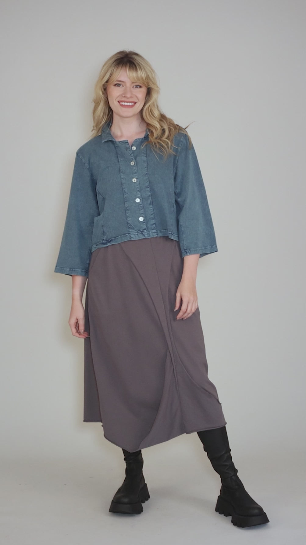 A stretchy jersey version of Tulip's best-selling Parker jacket! It is cropped, with a button-front placket, a small shirt collar and three-quarter-length sleeves. The silhouette is slightly shrunken, making this a terrific partner to higher-waisted bottoms, but the fit is still relaxed.