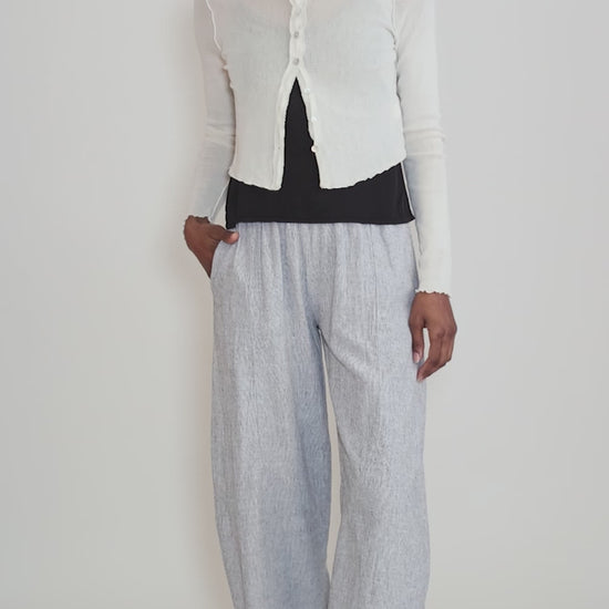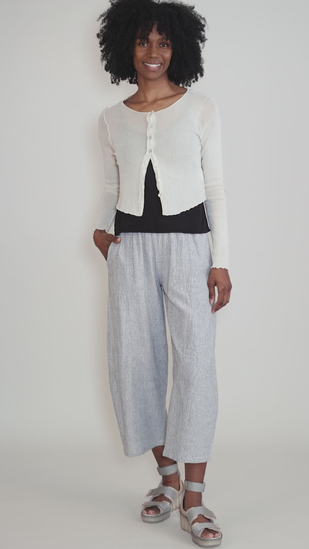 Done in a soft cotton mesh, this semi-sheer cardie has simple lines, making it the very thing to layer over all your sleeveless pieces. It has long sleeves and a hip-skimming length; a tattered length of ribbon backs the button placket in front. The fit here is a bit small; a few of our in-store customers have opted to size up in it.