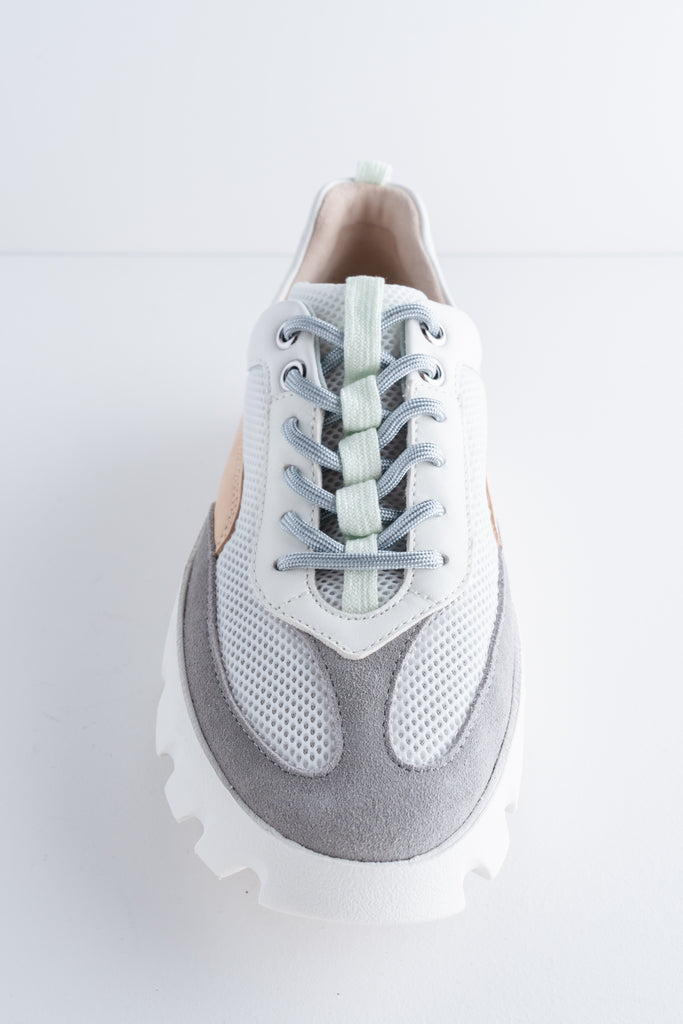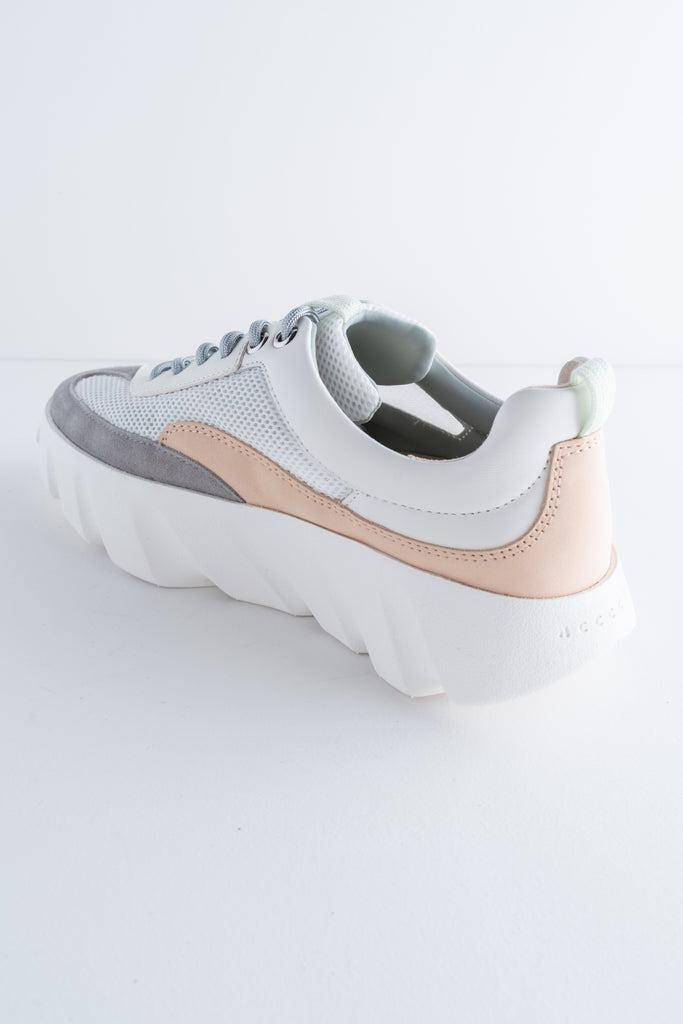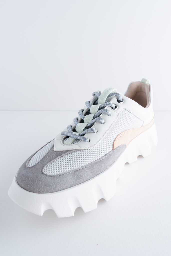 The Tura Flow Sneaker in white blends sporty ease with a sculptural edge. Made with coated mesh and a mix of sheep and cow leather, this style has a lightweight feel while still offering a strong visual impact. Silver accents, a padded collar, and an exaggeratedly ribbed sole give it a modern, elevated look, while the curved design is designed to support the natural motion of walking.