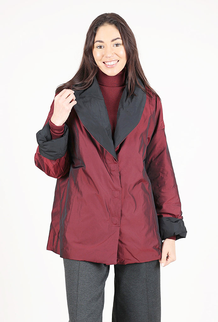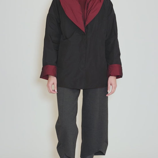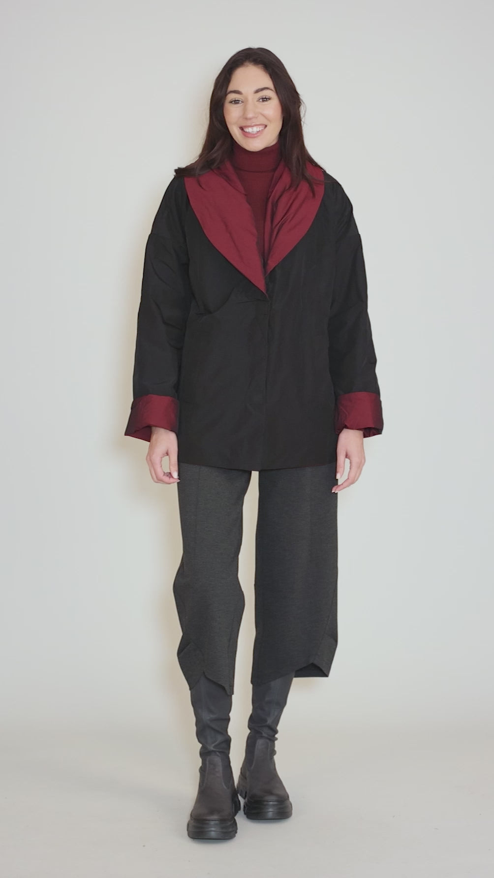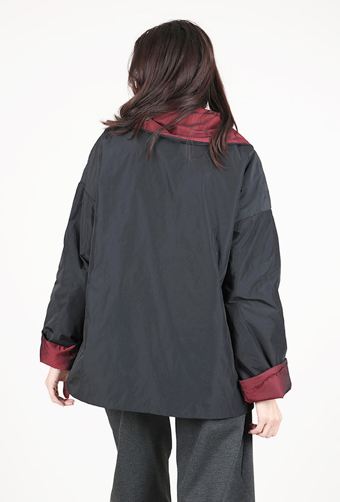 This reversible topper is black on one side and a shimmery chili red on the reverse. It's done in a sleek nylon, with discreet magnet closures and a very full, A-line silhouette. Slit pockets sit on the hips. Running a bit on the large side.