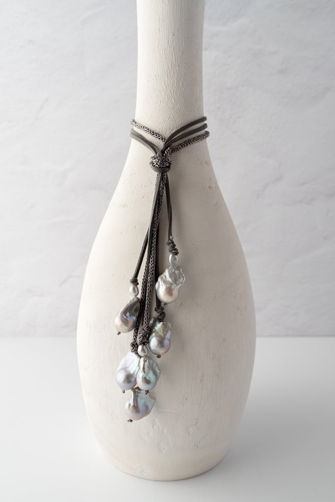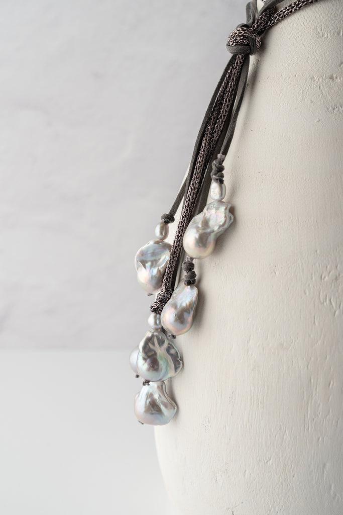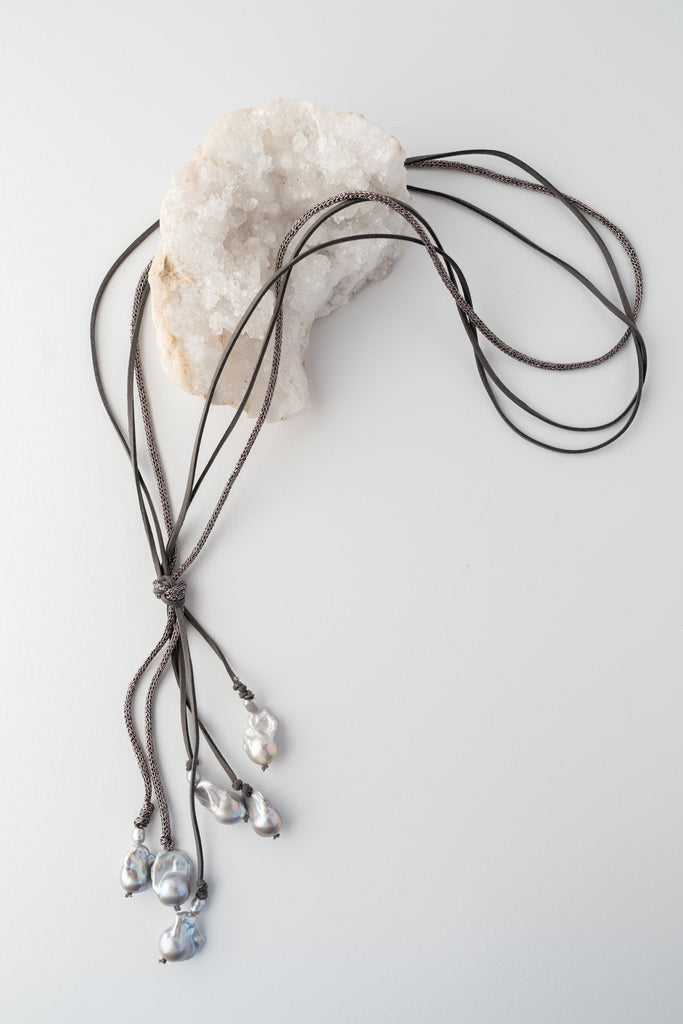The Verity Necklace blends modern ease with organic elegance. Soft graphite cord and metallic braid strands cascade into a cluster of luminous baroque freshwater pearls, each one uniquely shaped and full of iridescent depth. The lightweight, knot-detailed design adds beautiful movement and makes it effortless to slip on and style.