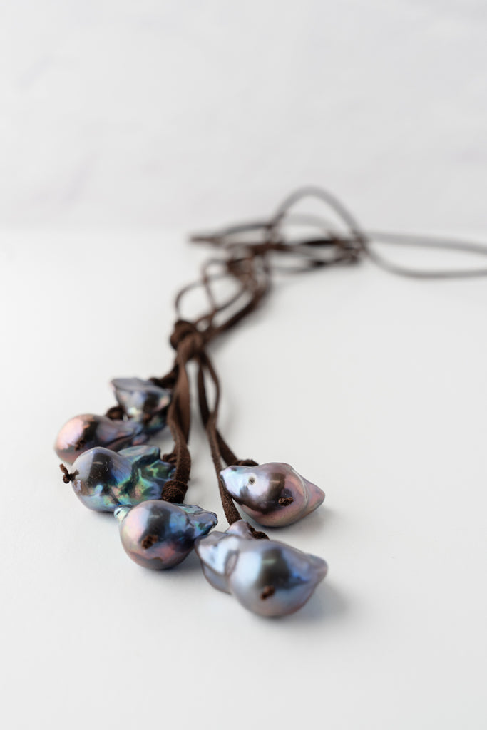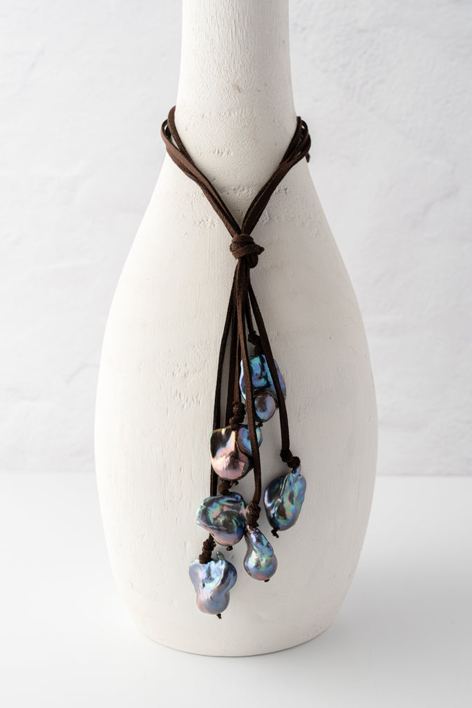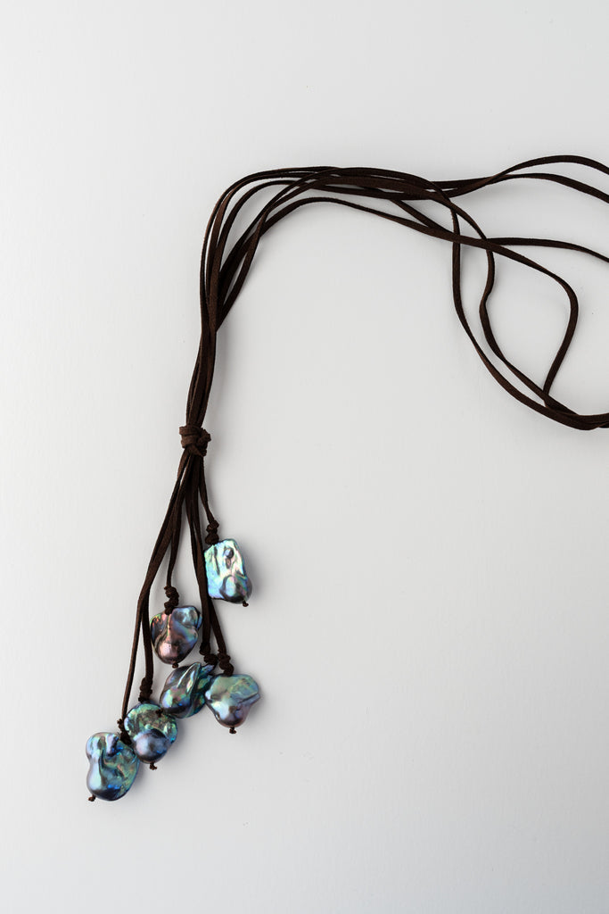 The Vivian Necklace features a cascade of iridescent baroque freshwater pearls suspended from a soft espresso-brown suede cord. Each pearl reflects deep greens, blues, and plum tones, creating a striking, organic contrast against the rich leather. Lightweight and effortlessly wearable, this piece brings a modern, earthy elegance to any outfit.