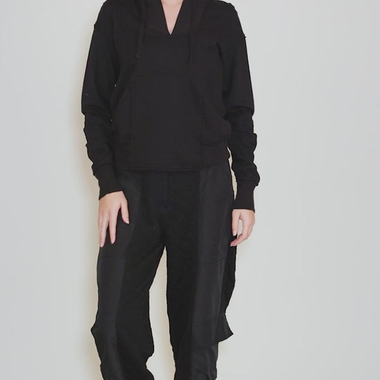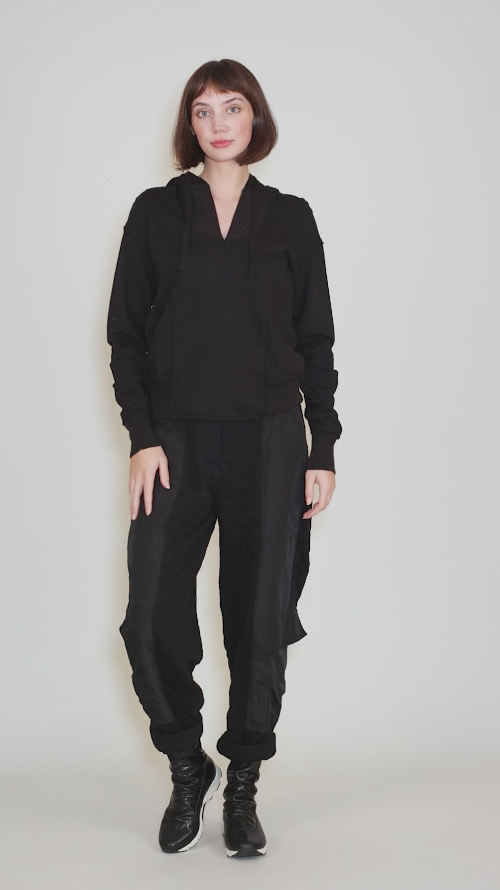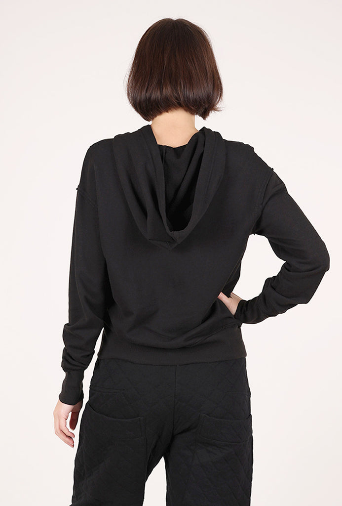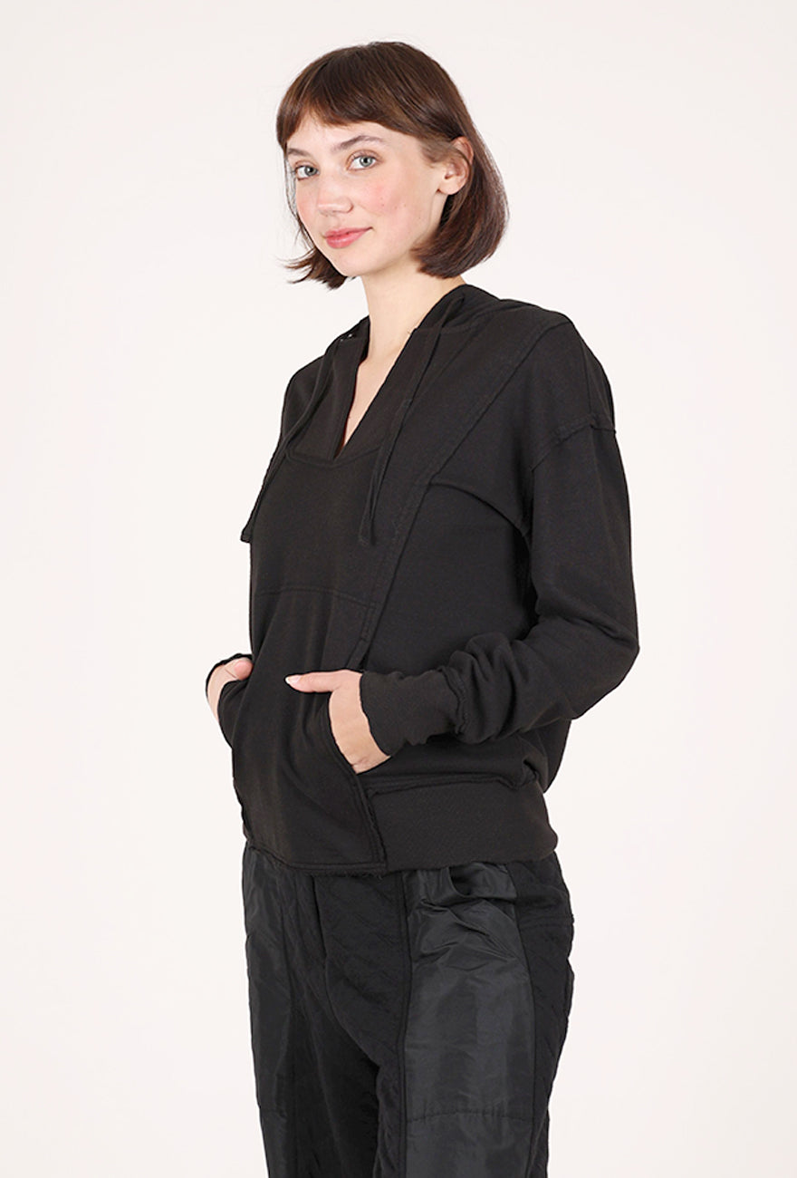 Done in a very soft, mid-weight cotton fleece, the hoodie has long raglan sleeves, a V neckline and a refined hood. The body is relaxed, but slightly shrunken in silhouette. Running true to size.
