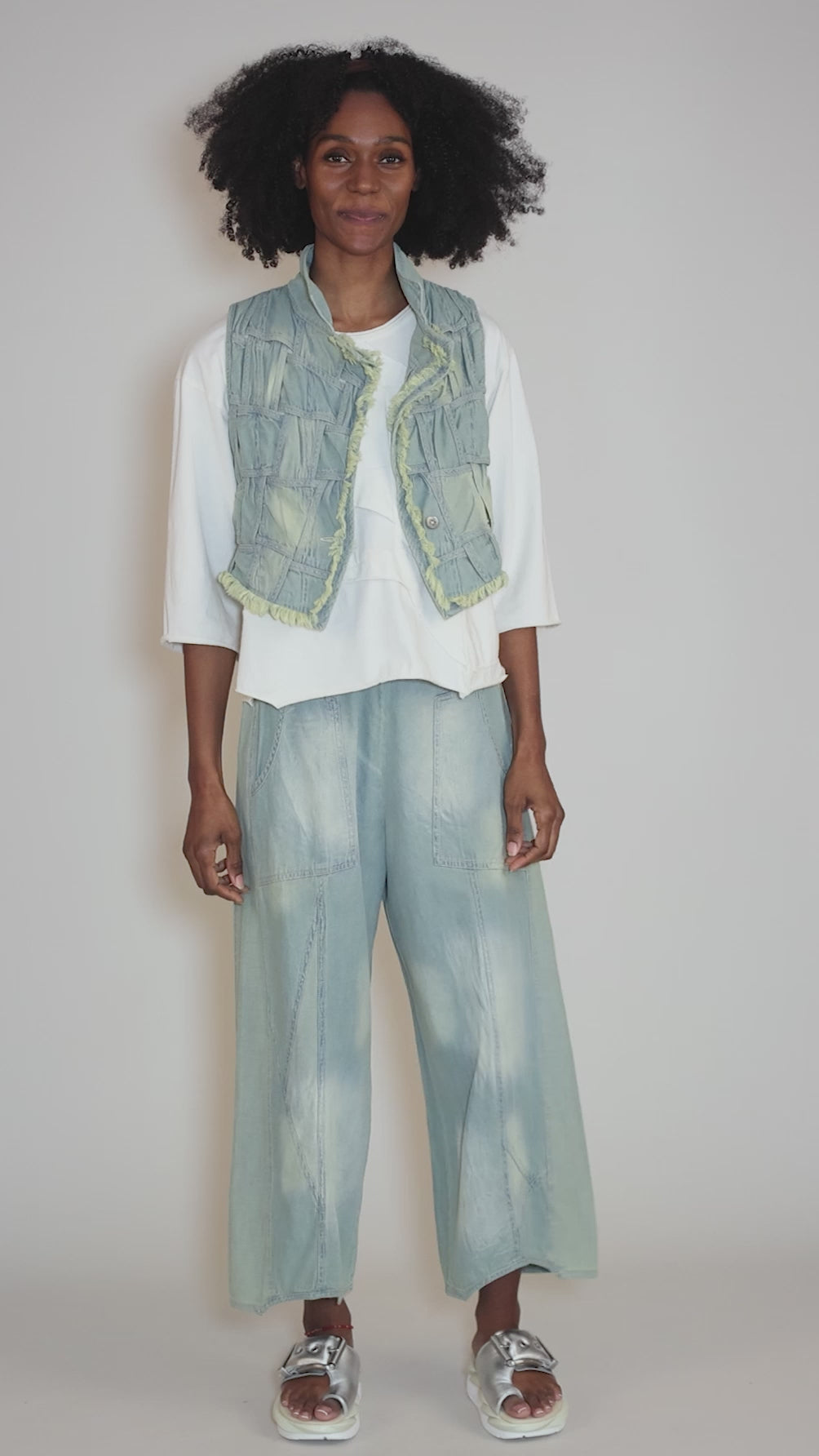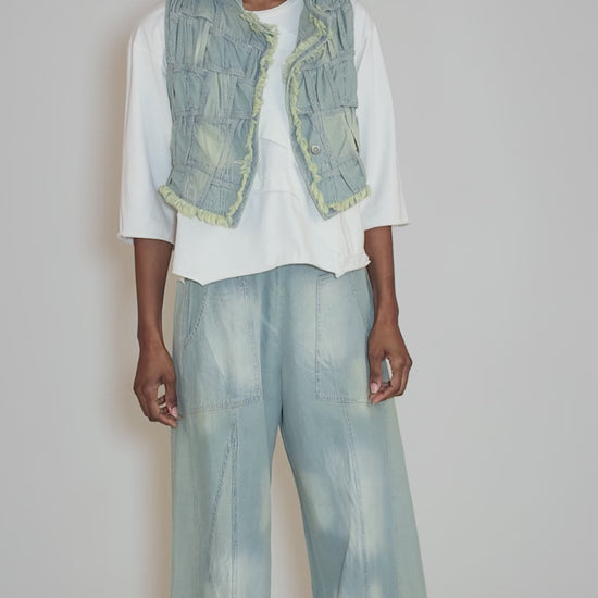 How cool is this piece! Weave is aptly named, as it features braided strips of distressed denim throughout, with raw, fringed edges and a totally hand-crafted look. We find this is running a bit small for the brand.
