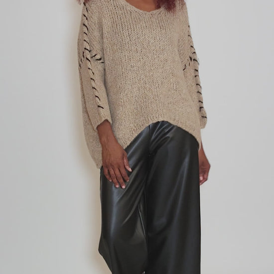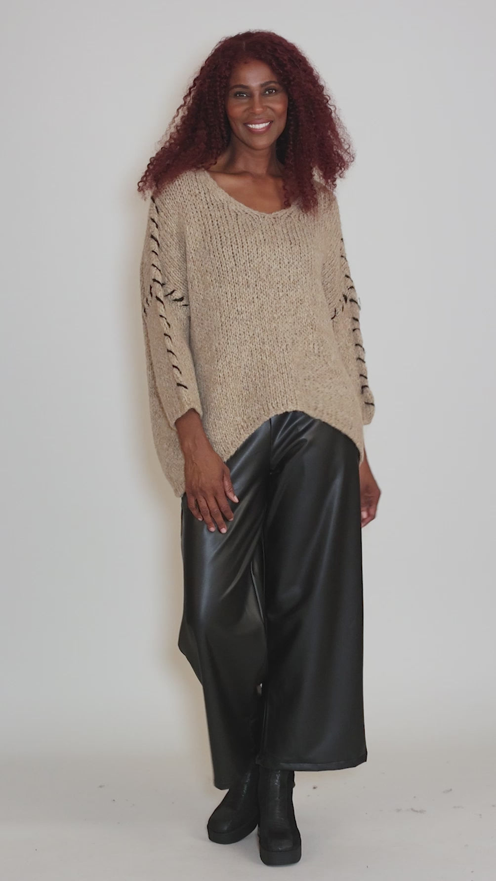 Knit in a soft. warm poly-wool-viscose blend, this oversized pullover has a V neckline, a drop-shoulder construction and deep dolman sleeves. The hemline is high-low, adding to the slouchy, relaxed vibe. Running quite large.