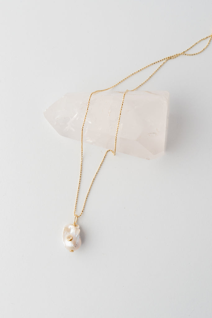 Such a cool little piece! Robindira Unsworth's gold-plated necklace features an organically shaped white baroque pearl, which is studded with tiny bezel-set white topaz stones. It's on chain that resembles tiny ball bearings.