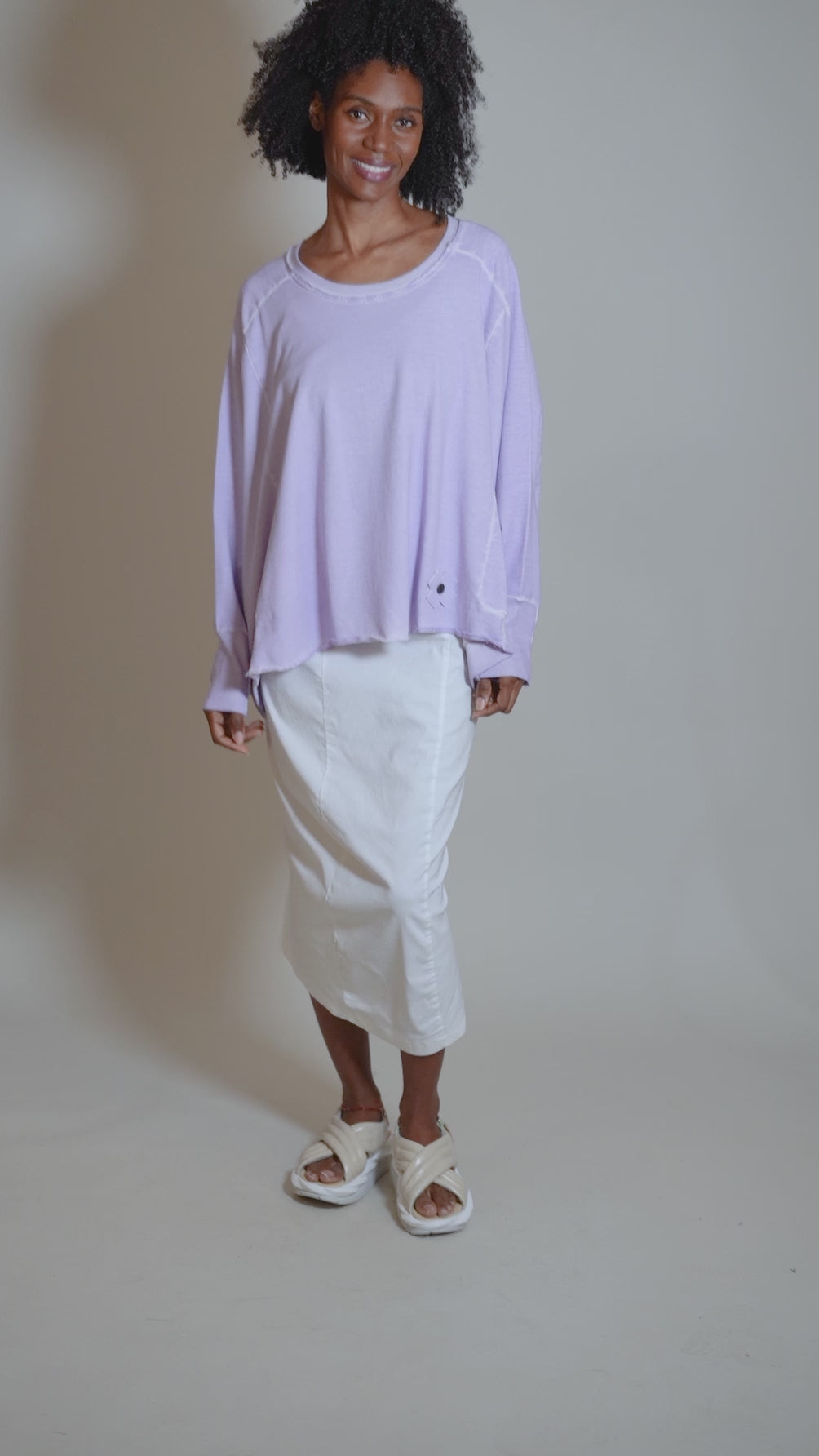 Made in a classic sweatshirt fleece, this oversized piece has a wide boat neckline, a drop-shoulder construction and very deep dolman sleeves. Ribbed details in back and at the end of the extra-long sleeves add those special Pluslavie touches, along with the brand's signature plus-sign embellishment.