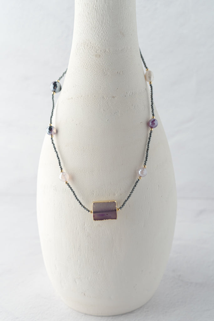 A delicate strand that balances elegance and color, featuring faceted purple beads, lustrous pearls, and gold accents. At its center rests a rectangular violet stone framed in gold, adding a modern focal point to the design. Perfect for layering or wearing on its own.