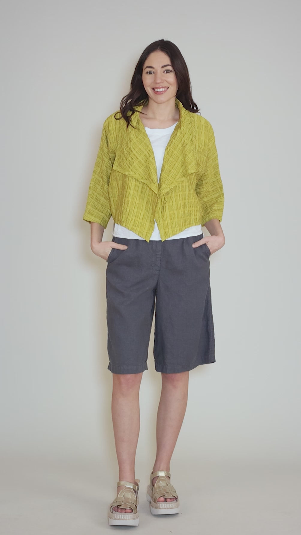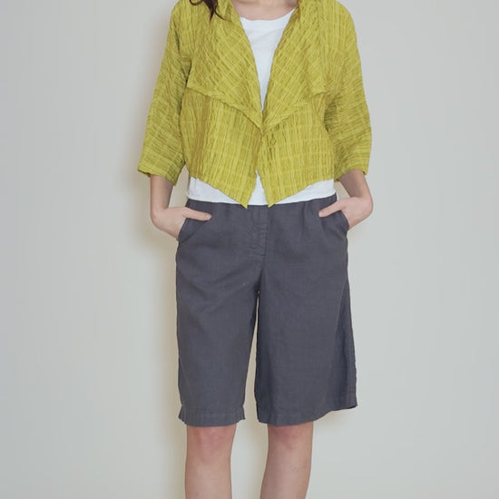 Done in a lightweight, woven Tencel blend, this little jacket has a shawl collar and an open-front construction. Its cropped length makes it quite versatile, perfect for layering over dresses and back to higher-waisted trousers.
