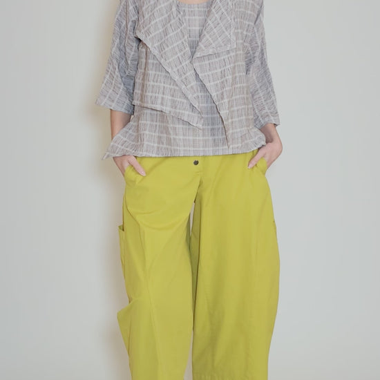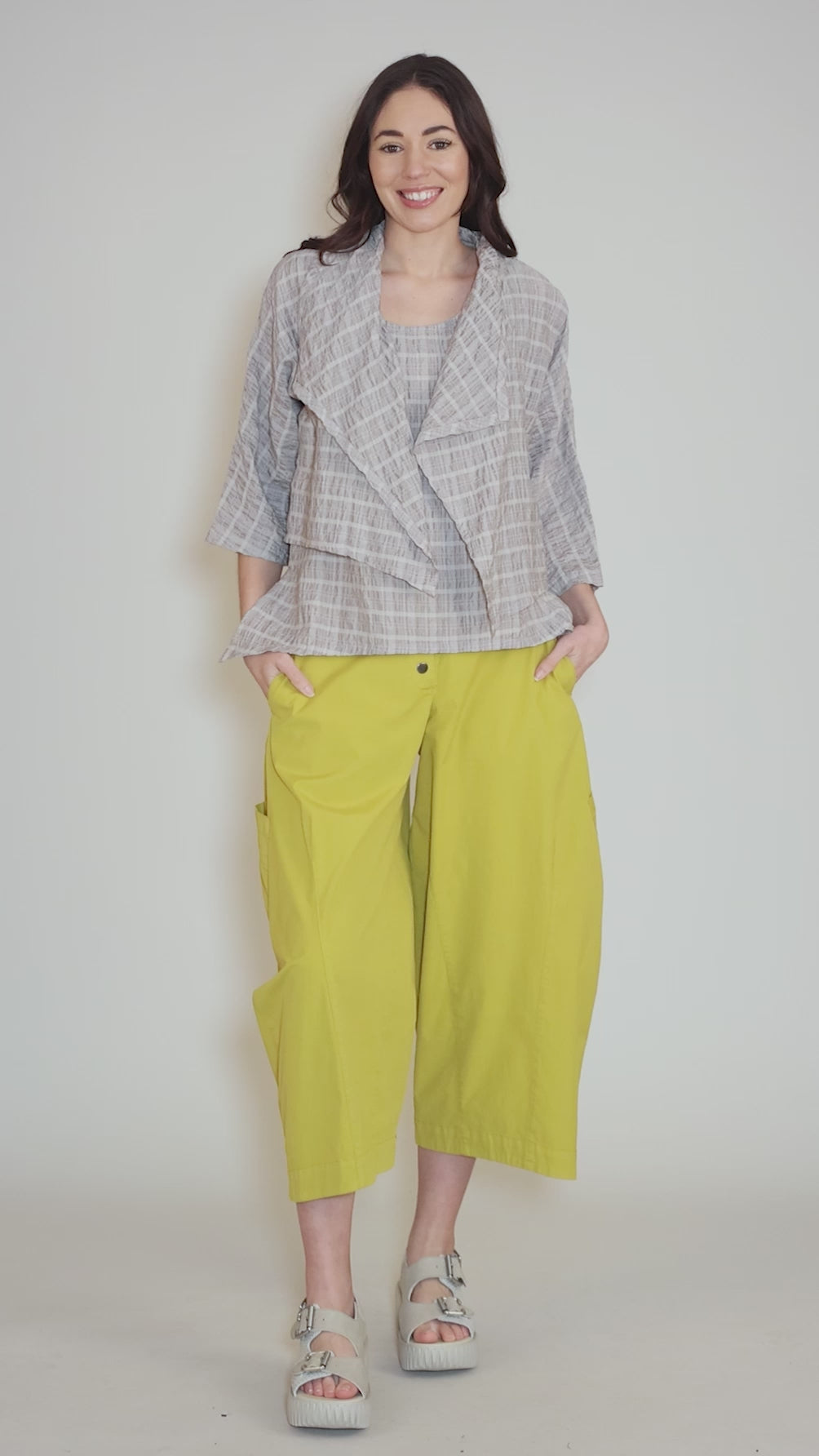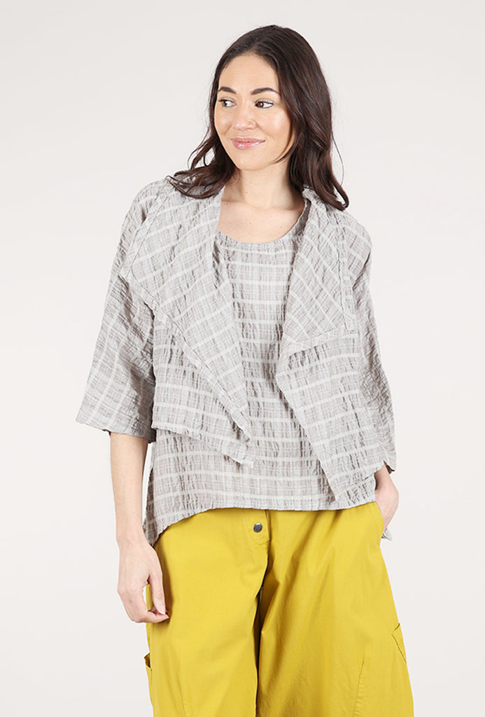 Done in a lightweight, woven Tencel blend, this little jacket has a shawl collar and an open-front construction. Its cropped length makes it quite versatile, perfect for layering over dresses and back to higher-waisted trousers.