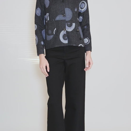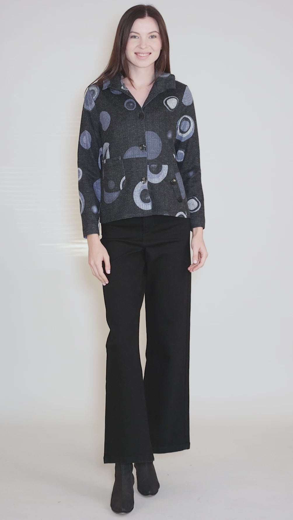 This lightweight jacket is made in a nicely brushed poly blend, with a set-in shoulder and long sleeves; a stand-up collar and a button-front placket add to its polished appeal. The silhouette is a trim A-line.